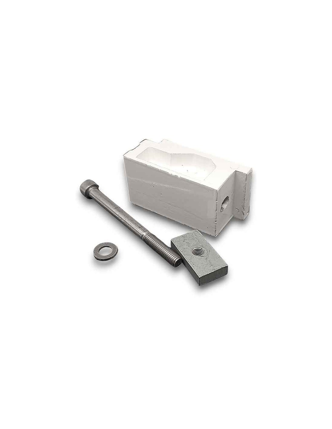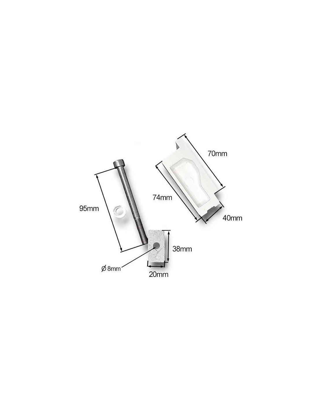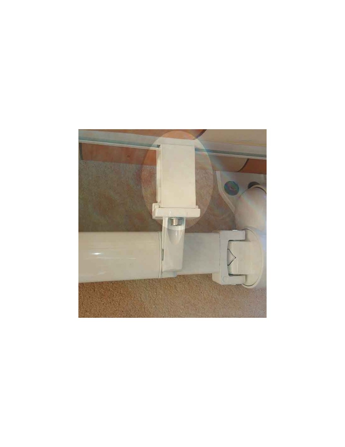 1 Giunto in alluminio per kit incrocio del marchio Mitjavila. Questo pezzo in alluminio laccato bianco viene utilizzato per unire il braccio al profilo di carico, quando i bracci si incrociano, in modo che non si urtino.